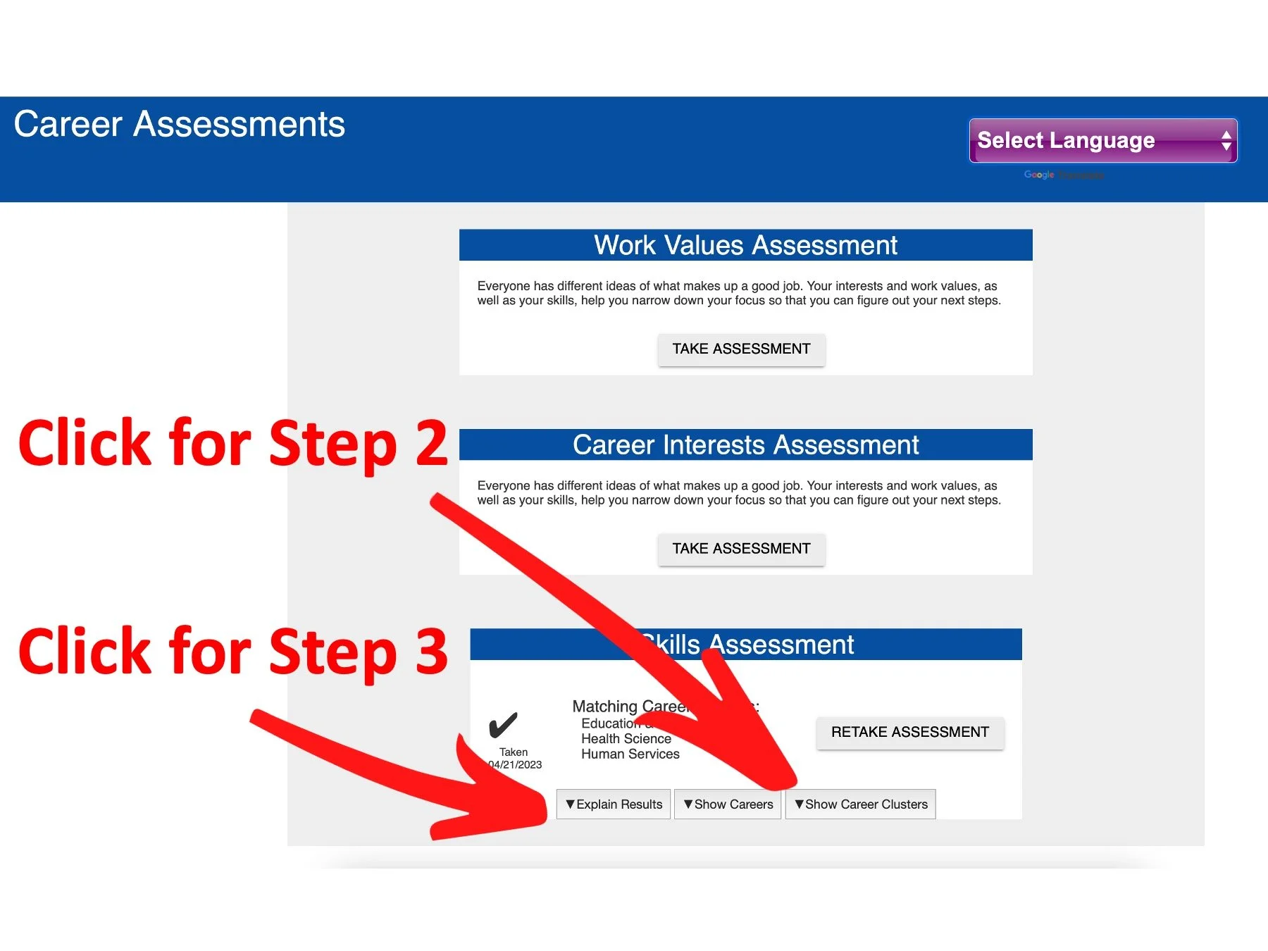 After completing the test, review your results under "Skills Assessment" by clicking "Show Career Clusters." These represent your top three career abilities.